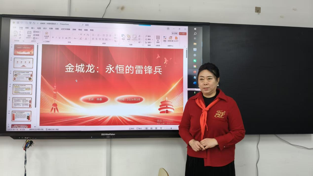 与此同时,林春副主任则以《金城龙:永恒的雷锋兵》为题,为孩子们深情讲述了辽宁大四学生金城龙的英雄事迹。他用朴实的语言还原了这位身边榜样在危急时刻挺身而出、舍己为人的感人故事,展现了当代青年学子的责任与担当。林主任通过一个个真实细节,引导同学们思考“什么是真正的勇敢”“青春该有的模样”,让同学们深刻体会到榜样就在身边,英雄精神可学可做,激励大家以金城龙为镜,在学习和生活中践行向上向善的青春力量。