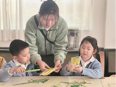 小朋友在认真制作仿竹编折纸乌篷船。大连新闻传媒集团/大连云记者孙卉 摄