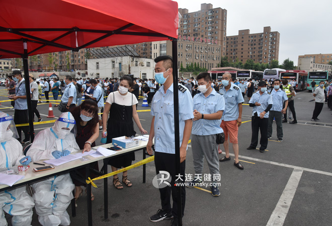 为做好公交职工的核酸检测工作,7月28日,大连公交集团职工核酸检测工作在三分公司华东路停车场进行。 检测现场开辟了10条检测通道,各单位组织有序,登记人员防护到…