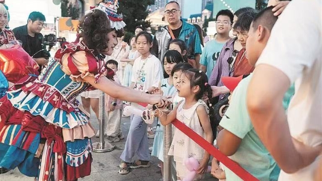 巡游演员与小朋友欢乐互动。 受访单位供图本报讯(钟泽辉 大连新闻传媒集团记者邰治)7月20日晚,海昌·东方水城圣马可广场灯光璀璨,首届奇幻夏日·水城幻戏奇遇巡游…